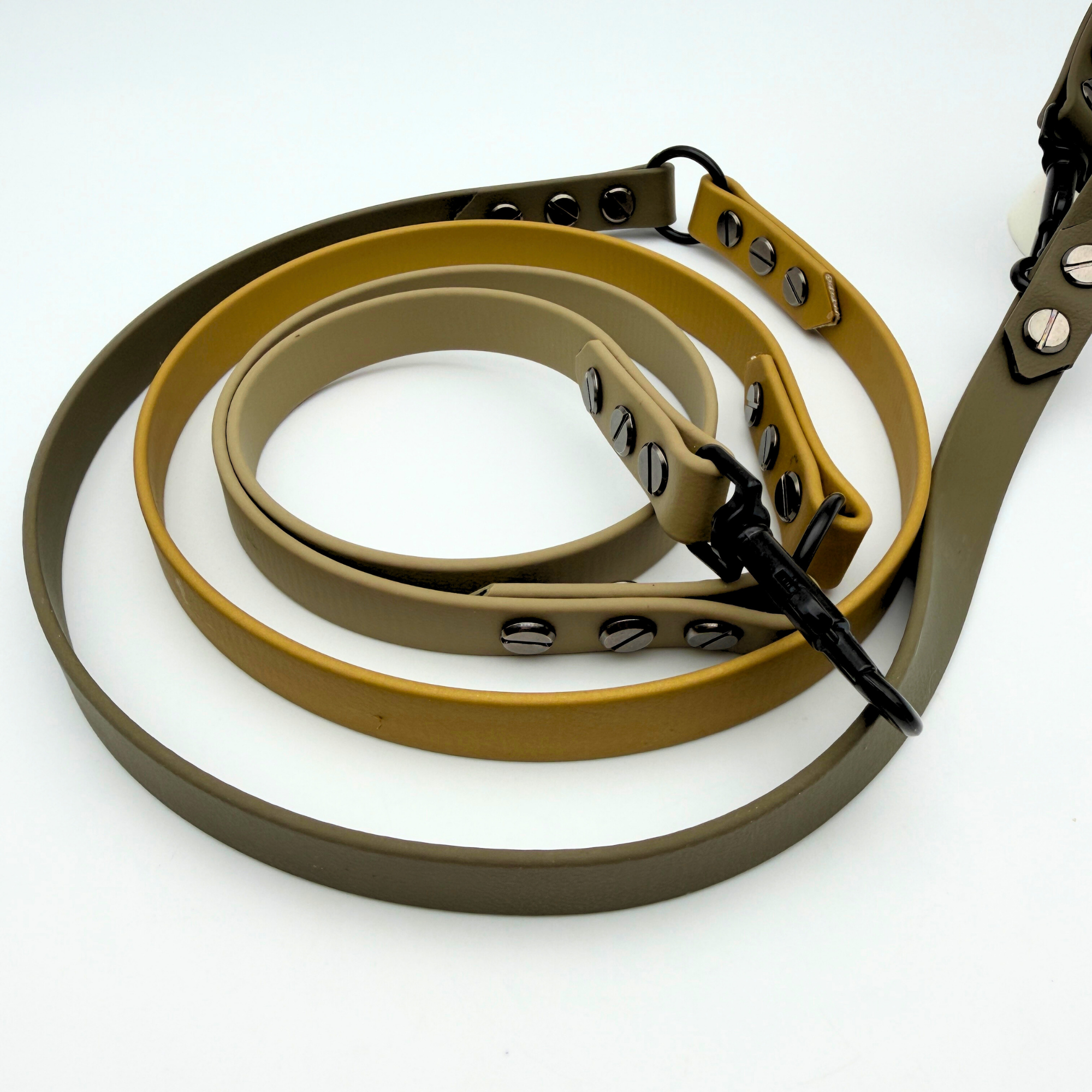Jetzt wird es bunt! Da die Leine Emil aus drei Teilen besteht, kannst du für jeden Teil eine eigene Biothane-Farbe wählen.
