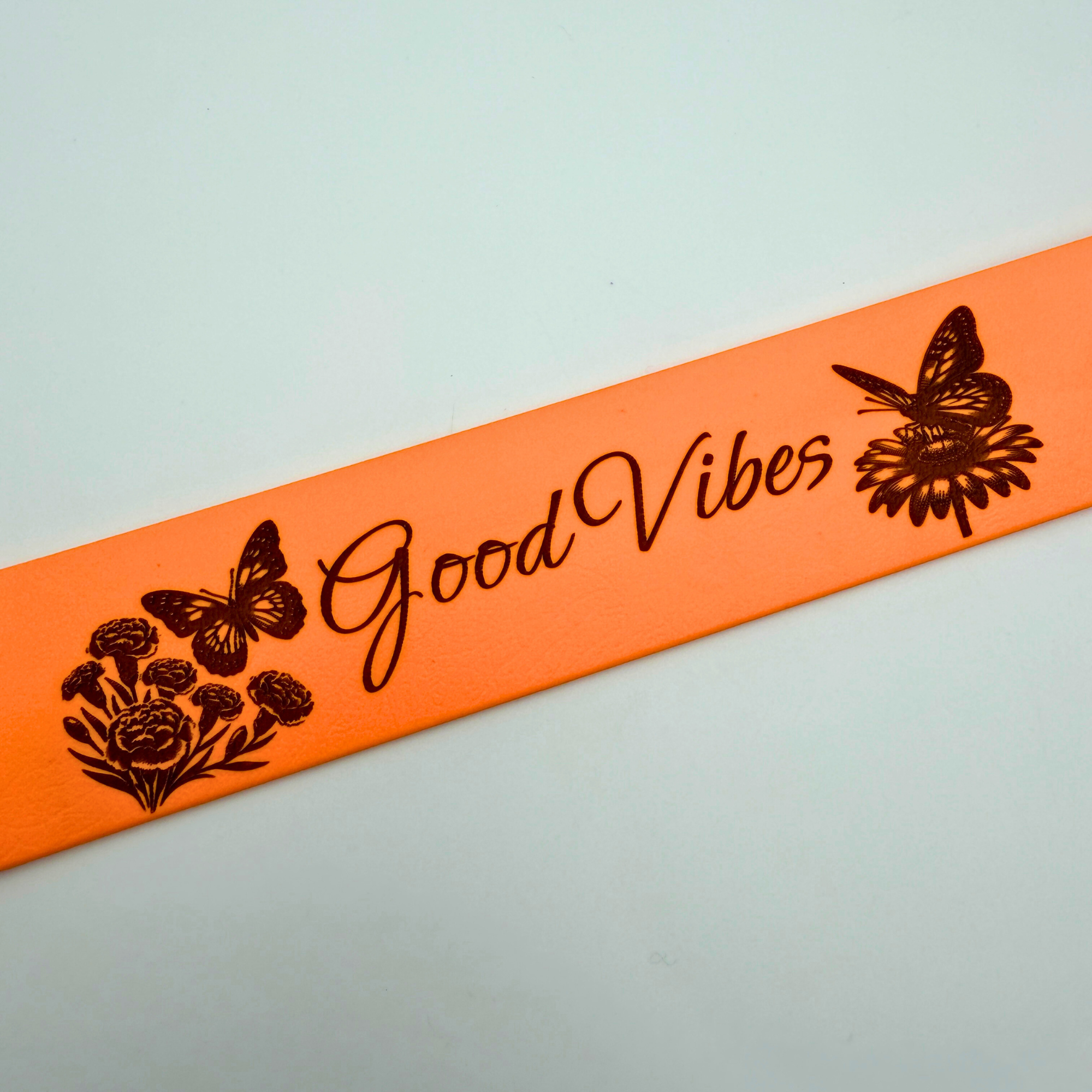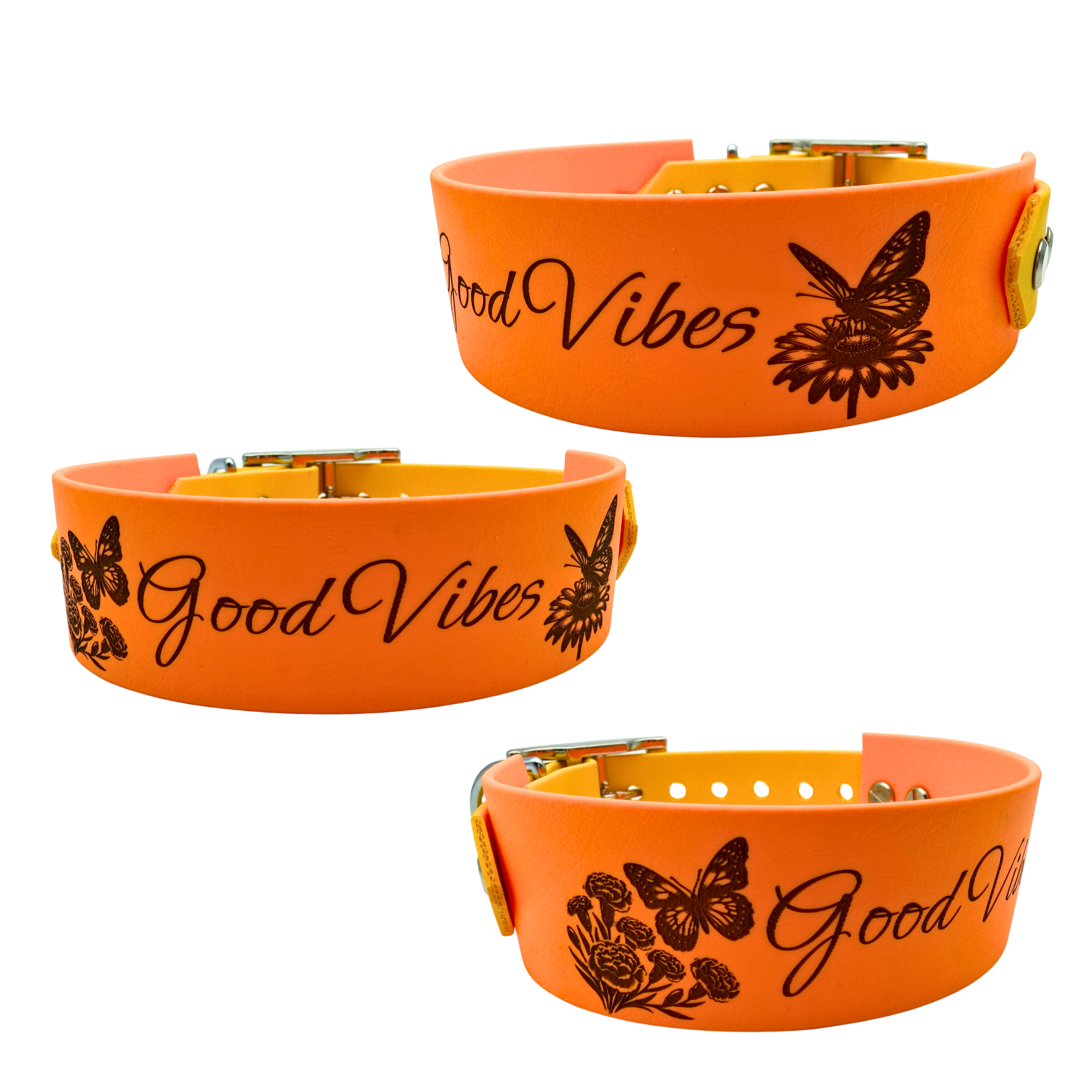 - Lebendige Gravur: Der Laser zaubert einen ganz natürlichen Look. Die Gravurfarbe variiert dabei je nach Halsbandfarbe von einem warmen Mittelbraun (auf hellen Tönen wie Pastellgelb) bis zu Tiefschwarz (auf dunklen Biothane Farben). Das gibt dem floralen Design einen tollen Vintage-Charakter.