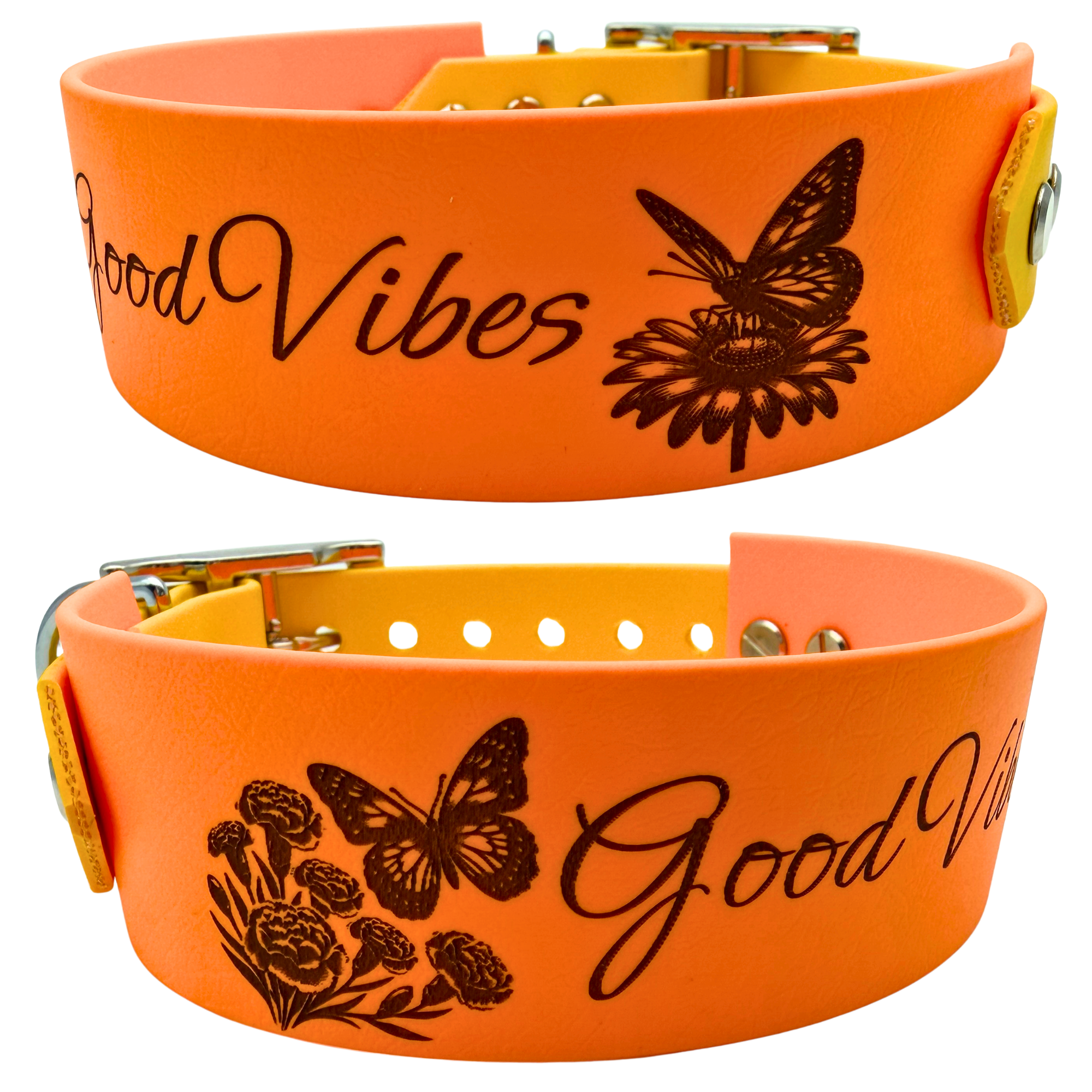Weil Details Platz zum Blühen brauchen! Eine Blumenranke oder ein detaillierter Schmetterling brauchen Raum, um zu wirken. Damit die feinen Linien der Blüten und Tiere nicht untergehen, fertigen wir die "Floral"-Edition exklusiv als breites 38mm Halsband. Das sieht nicht nur wunderschön aus, sondern ist durch die breite Auflagefläche auch besonders sanft zum Hundehals.