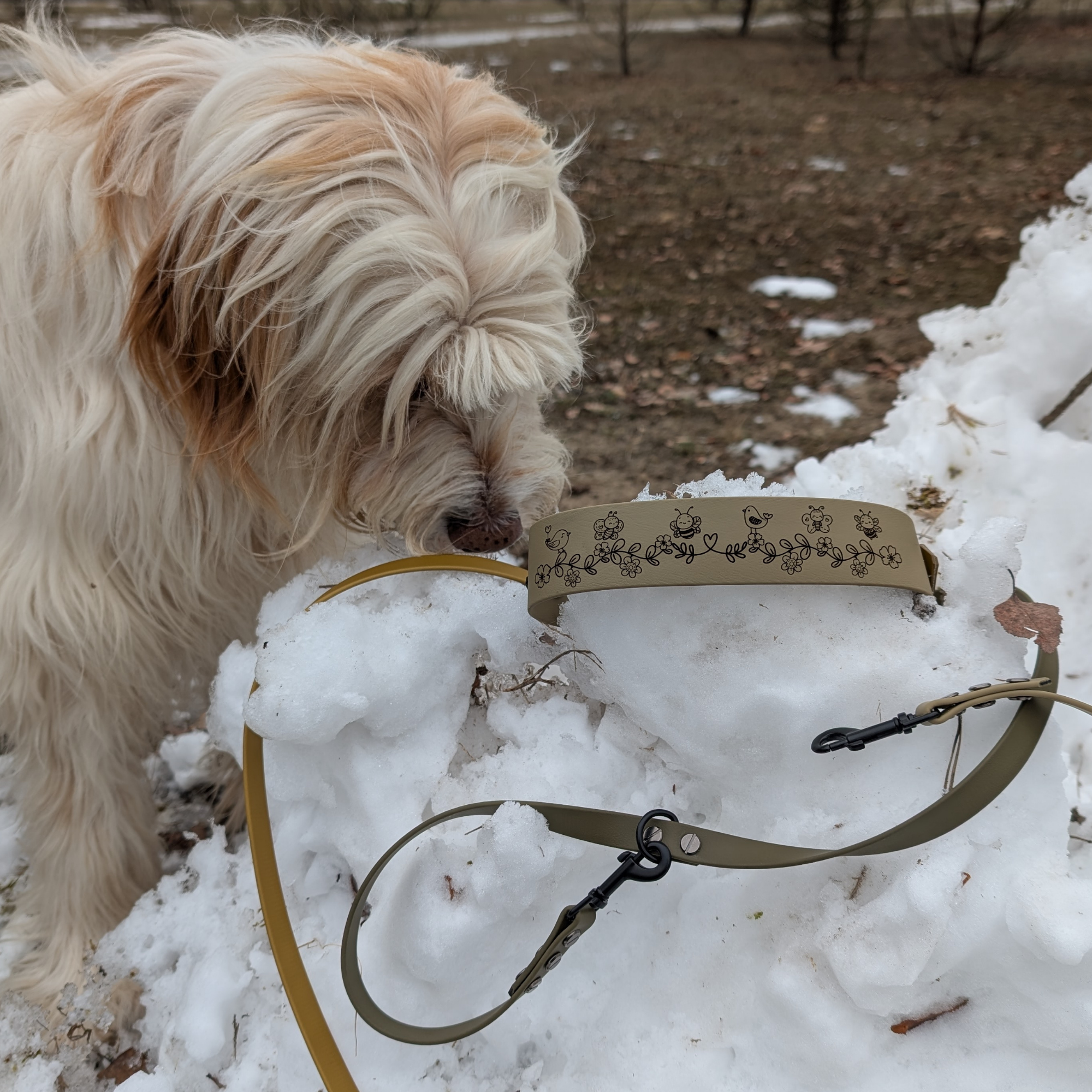 Wir verwandeln das Halsband in eine blühende Wiese. Hier treffen zarte Ranken und wunderschöne Blüten auf deine Lieblingstiere. Ob du dich für die fleißigen Bienen & Schmetterlinge entscheidest, oder lieber einen Fuchs oder Waschbären inmitten eines Blütenmeers hättest – dieses Design ist pure Romantik, die trotzdem jedes Abenteuer mitmacht.